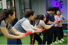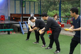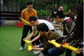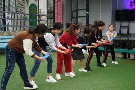 第二阶段为拓展活动,由音乐系主任黄佳负责组织开展。活动分为声乐、舞蹈、键盘和办公室四组进行小组比拼活动,每组6人,三局两胜进行“移动保龄球”接力传球,活动中每组队员全情投入,群策群力,互助互信,积极沟通,充分发挥团队协作精神,一起克服困难,经过重重比拼,最终声乐和舞蹈组获胜。