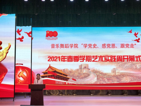 院长曾宏华致开幕词并宣布艺术实践周开幕。他要求学生们要“学党史、感党恩、跟党走”。他还通过近期我院师生在各项艺术比赛中所获得的成绩勉励在场的同学们。并强调,艺术实践周是学院艺术实践教学的浓缩,也是办学成果的呈现,是全体同学施展才艺的舞台,更是同学们相互学习的舞台。希望同学们在比赛中讲风格、讲友谊,互相帮助,大胆竞演。