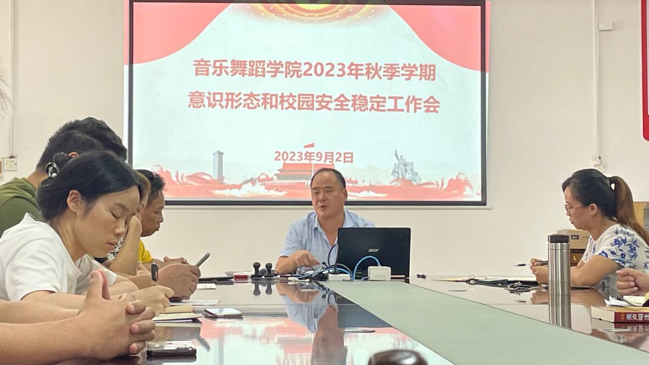 在会议中,周佐霖首先通报了暑期学院就业、科研、采风排练等方面工作的运行情况,并对存在的问题和风险点进行了分析和研判。随后传达了全区教育系统意识形态和校园安全稳定工作会议精神以及自治区教育厅关于做好2023年秋季开学和中国—东盟博览会、中秋节、国庆节期间学校安全稳定工作的相关要求,再一次认真学习学校8月28日的专题会议精神,要求学院全体教职工结合学院实际情况,主动追踪分析研判师生思想动态,主动前移工作阵地,紧盯交通安全、溺水、酒驾、舆情发酵等风险点,在教育教学实践过程中,必须自觉提高政治站位,坚定政治立场,绝不允许在校园传播违法、有害观点和言论,党员同志要强化党员身份意识和责任意识,充分发挥党员的先锋模范作用,筑牢齐抓共管的良好工作局面。