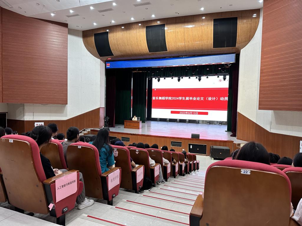 为做好我院2024届毕业生毕业论文(设计)工作,进一步提高毕业论文(设计)水平和质量。9月13日下午,我院在艺术楼表演厅顺利组织召开2024届毕业生毕业论文(设计)动员会,2024届全体毕业生参加,会议由院长曾宏华主持。