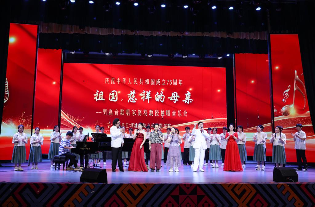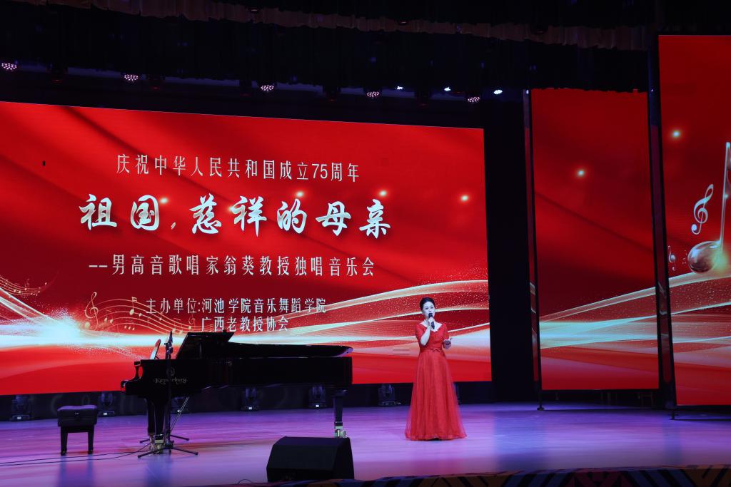 为庆祝中华人民共和国成立75周年,5月23日晚,广西著名歌唱家、声乐教育家翁葵教授《祖国,慈祥的母亲》独唱音乐会在河池学院艺术楼表演厅隆重举行。好博官网音乐专业的全体师生齐聚一堂,共同欣赏了这一场音乐盛会。