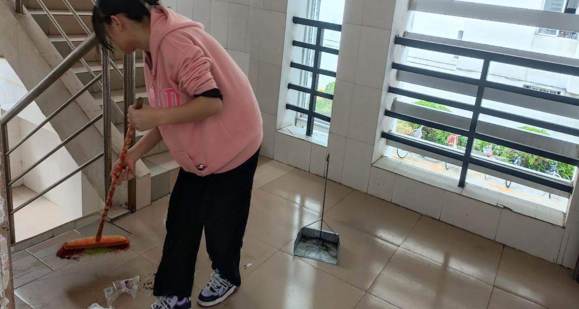 活动中,同学们根据责任区域,以饱满的热情投入到宿舍区清洁活动中。同学们手拿扫帚、拖把、抹布等工具,大家分工有序,配合默契,清扫宿舍区每个角落,不留死角,不留盲区,同学们清理过的地方,卫生环境焕然一新。经过大家的辛勤劳作,宿舍区呈现出一片整洁有序的新景象。